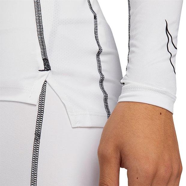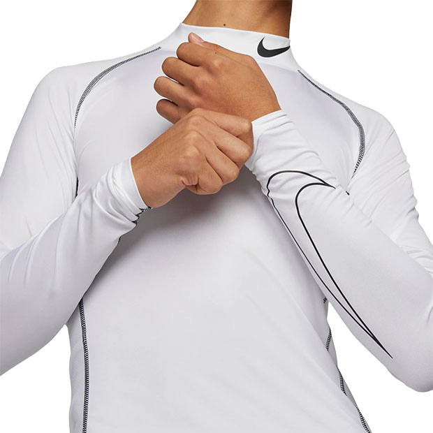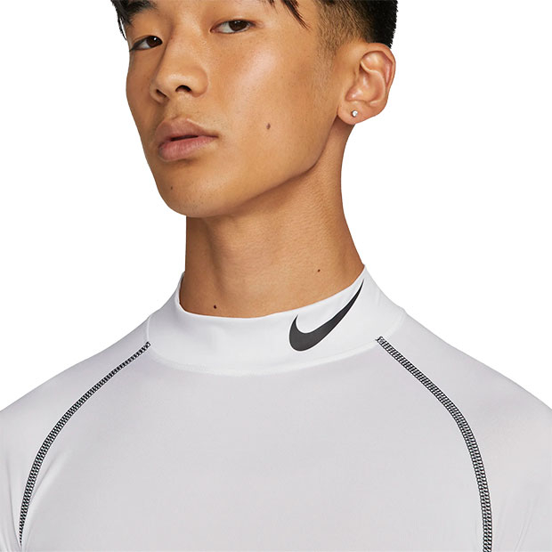 熱がこもりやすいエリアに軽量の通気性素材を使用。ウォームアップからクールダウンまで、さらりと涼しい状態をキープ。伸縮性のあるモックネックデザインは、保温性をプラスするタイトなフィット感。