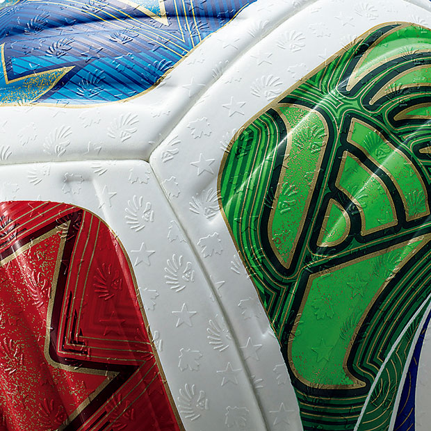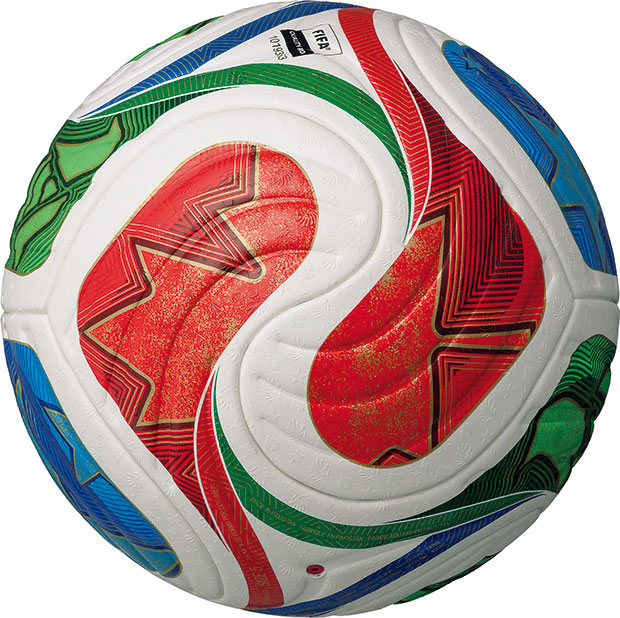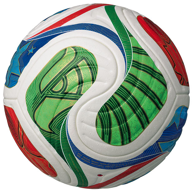 「2026 FIFAワールドカップ(FIFA World Cup 26)」で使用される公式試合球。開催国であるアメリカ・カナダ・メキシコの3か国を表現した「TRI」と、スペイン語で「波」を意味する「ONDA」をネーミングに採用。開催国の国旗からインスピレーションを受けた、星・カエデの葉・鷲のエンブレムが融合したトリコロールカラーのウェーブパネルデザインが、「Spirit(魂・精神)」と「Connection(絆・つながり)」を表現。過去最小枚数・同一形状の4枚のパネルで構成。表面のエンボス加工(突起状シボ)がボールの飛行安定性とグリップ性を向上。サーマルボンディング製法により、縫い目の無い表皮構造で正確なパスやシュートを実現。