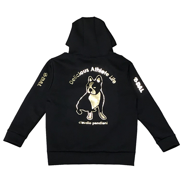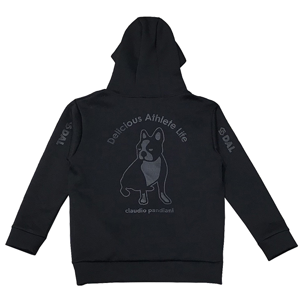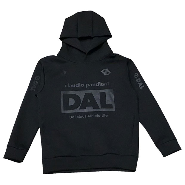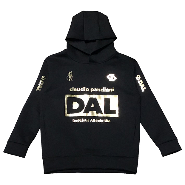 ブランドメッセージ「DAL(Delicious Athlite Life)」を配したプルオーバーパーカー。軽くてシワになりにくく、ストレッチ性と保温性を兼ね備えたダンボールニット素材を使用。