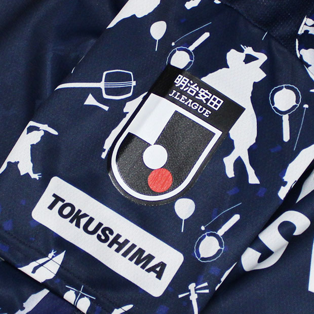 2026年明治安田百年構想リーグ着用ユニフォームのオーセンティックモデル。青と緑を基調に踊り子の姿や鳴り物のリズムを施した「AWAODORI」スペシャルユニフォーム。大人/メンズ用。