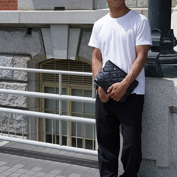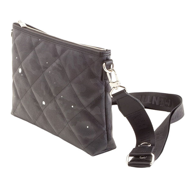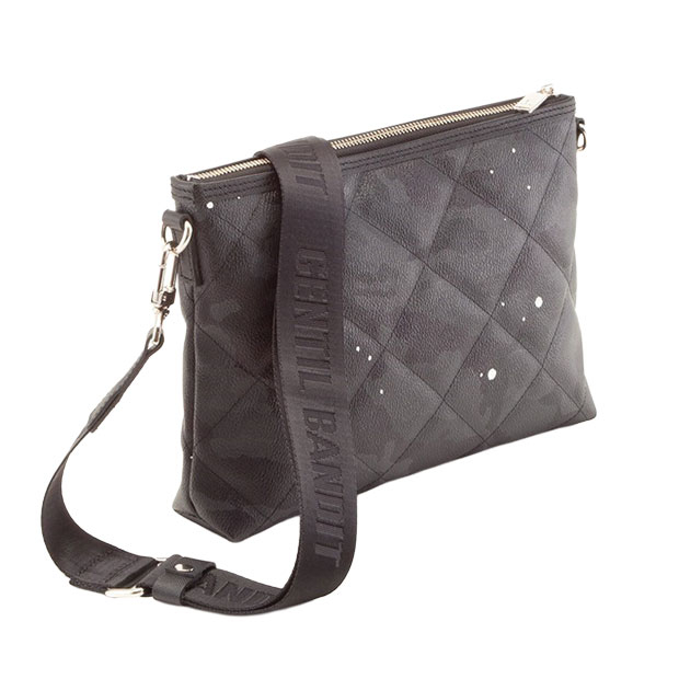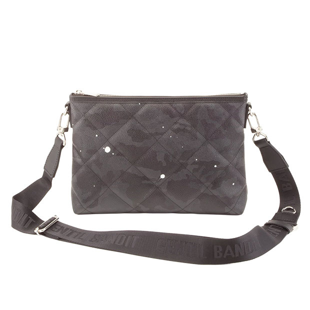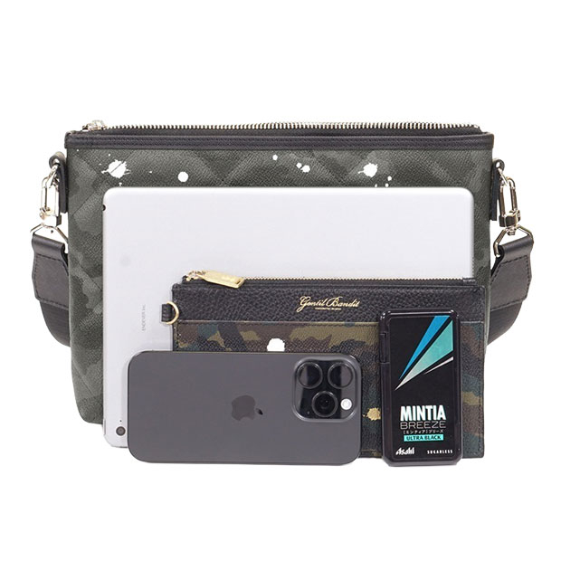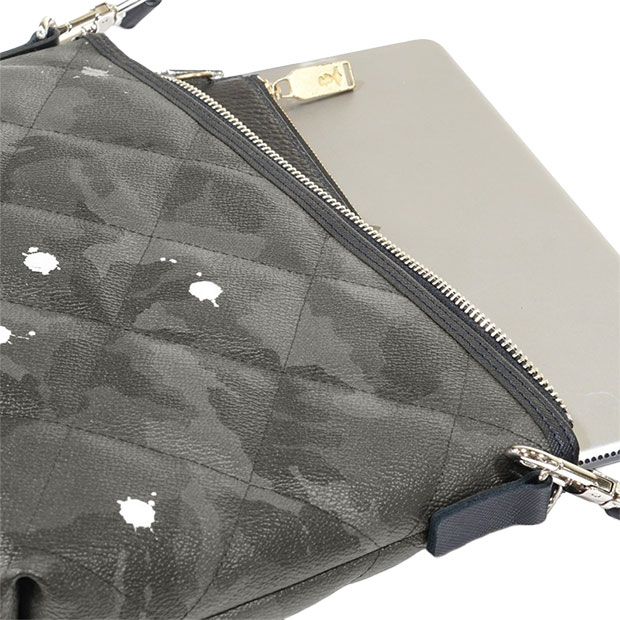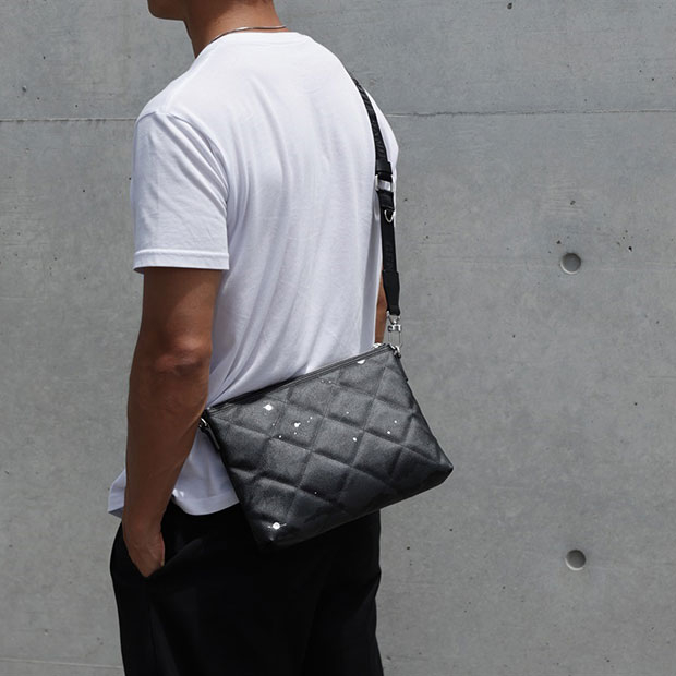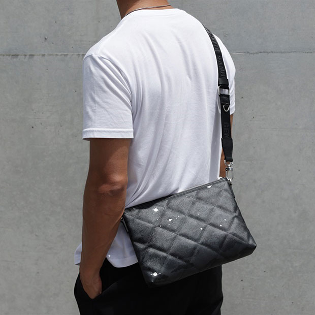 光の当たり方で異なった見え方をする絶妙なバランスのカモフラージュ柄が特徴的な、キルティング素材を使用したクロスボディバッグ。裏地に滑らかな手触りのマイクロスエードを使用。本体にマチを持たせることで、タブレットも収納可能な作り。