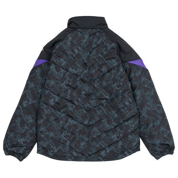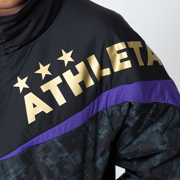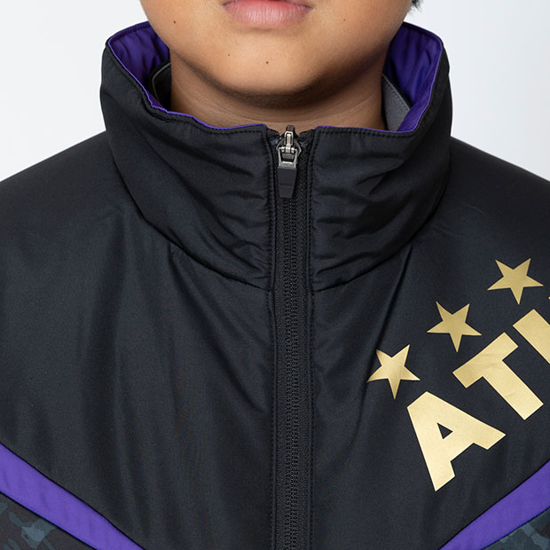 防寒性に優れた中綿仕様のジャケット。ゴールドのロゴがおしゃれなこだわりのアイテム。冬の移動時や試合観戦時に活躍。
