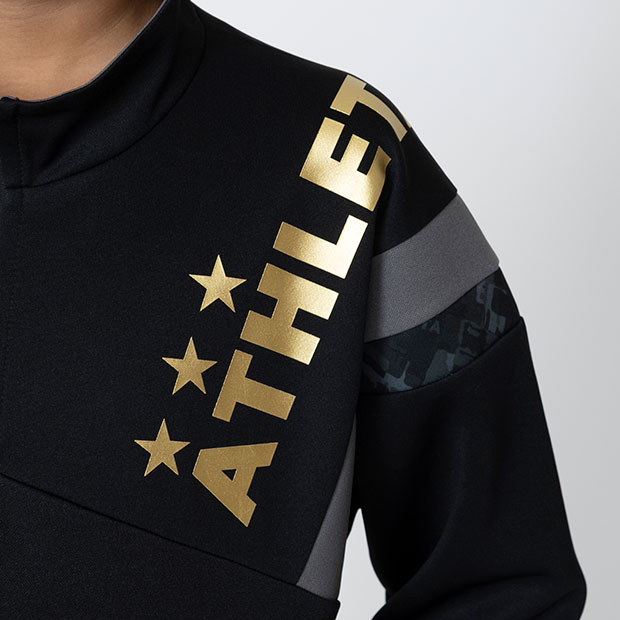 軽量ジャージトップ・パンツ上下セット。ゴールドのロゴがおしゃれなこだわりのアイテム。冬の移動時やトレーニング時に活躍。