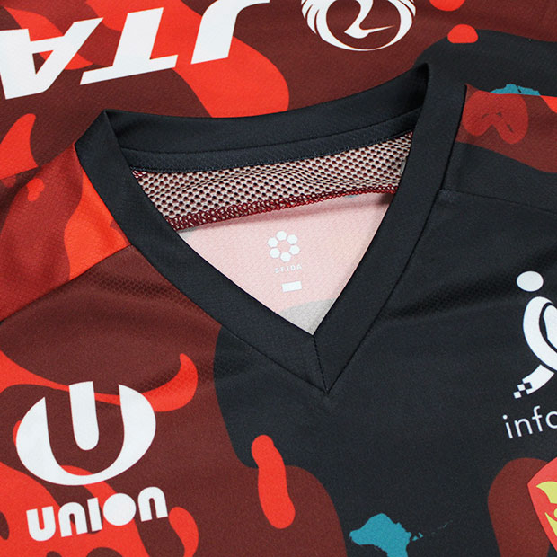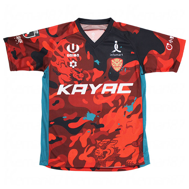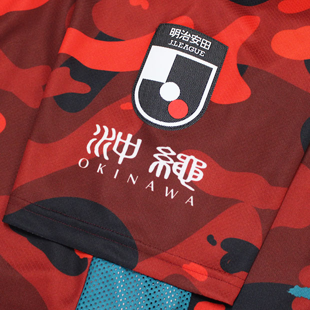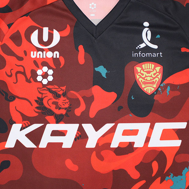 2026年明治安田百年構想リーグ着用ユニフォームのオーセンティックモデル。琉球の獅子(シーサー)がテキスタイルの中を縦横無尽に駆け回る姿をモチーフに、どんな相手にも立ち向かう強さと躍動感を表現。