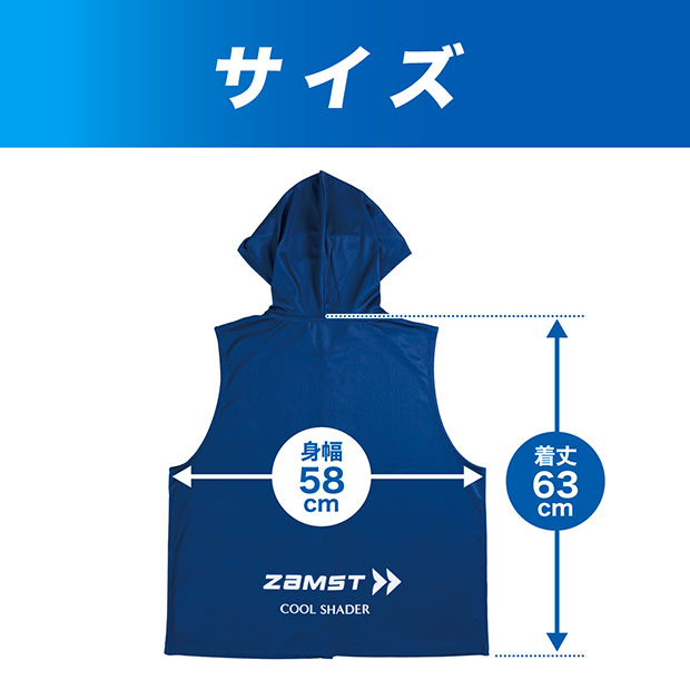 水に濡らして絞って振るだけで、気化熱により冷却効果を発揮。スポーツ中の暑さ・UV対策に最適。頭からかぶってしっかりとクールダウンできるフード付き仕様。運動時も動きやすい袖なしタイプ。