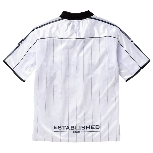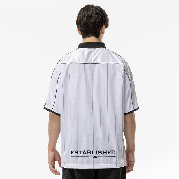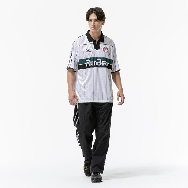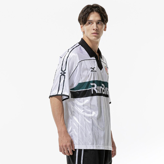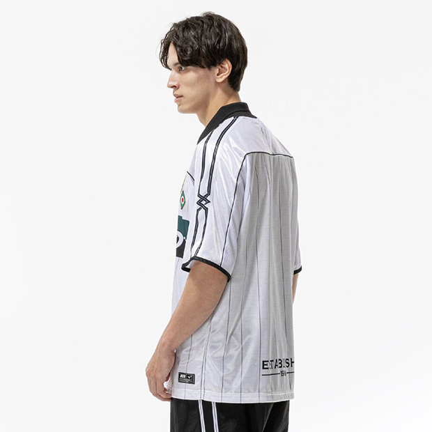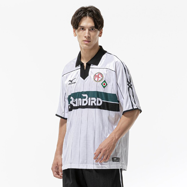 フットボールをライフスタイルに取り入れるカジュアルシリーズ「MZFB」の半袖シャツ。レトロな風合いと光沢感を持つ生地を使用。襟にフライス、刺繍ワッペン仕様のブランドロゴとエンブレムを採用した、1990年代を彷彿とさせるデザイン。全体的にゆとりを持たせたオーバーサイズシルエット。