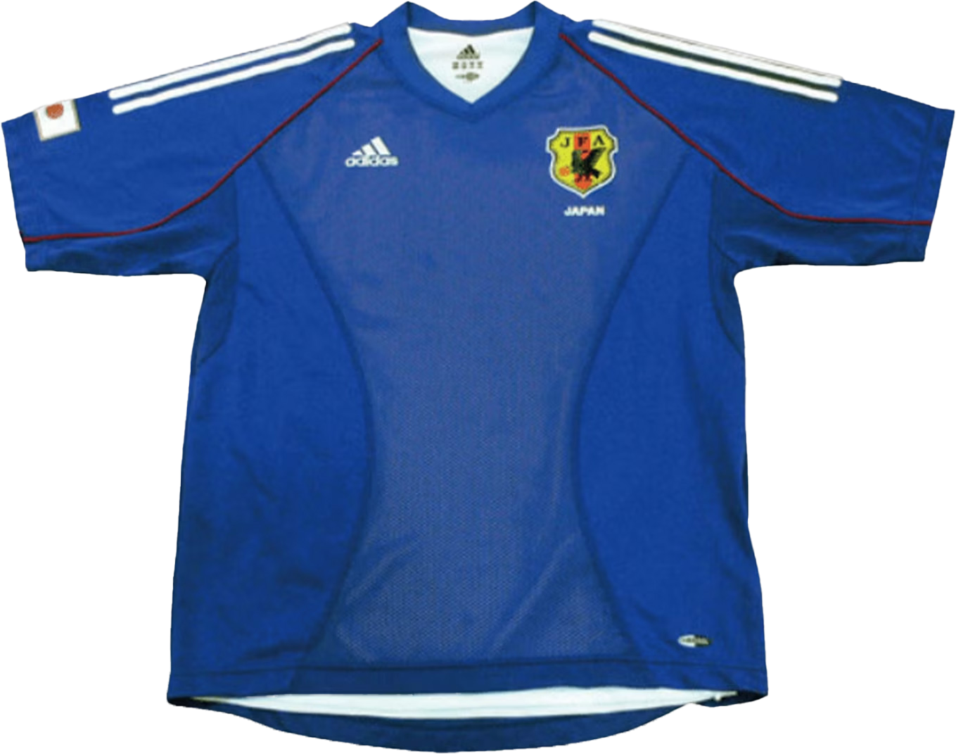 2002 FIFAワールドカップ 韓国 / 日本™着用。シンプルなデザインで日本の美を表現しており、首から袖口にかけての赤いパイピングは湖面に映る「逆さ富士」をイメージしたもの。高温多湿対策のため、裏地にメッシュを使った二重構造を採用。さらに徹底的な軽量化が図られた。2002 FIFAワールドカップ 韓国 / 日本™ベスト16。