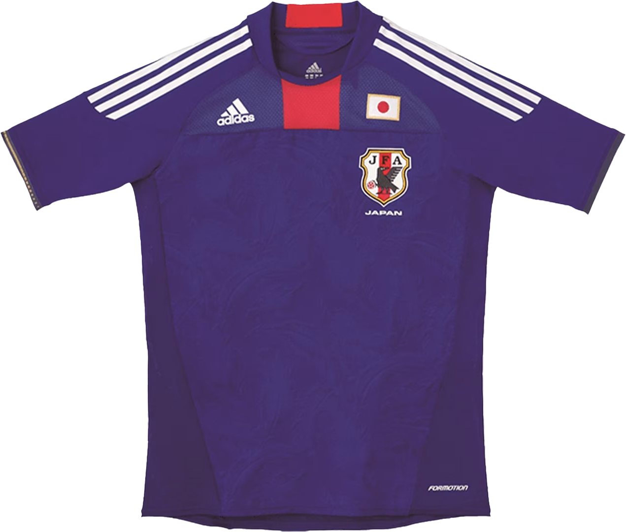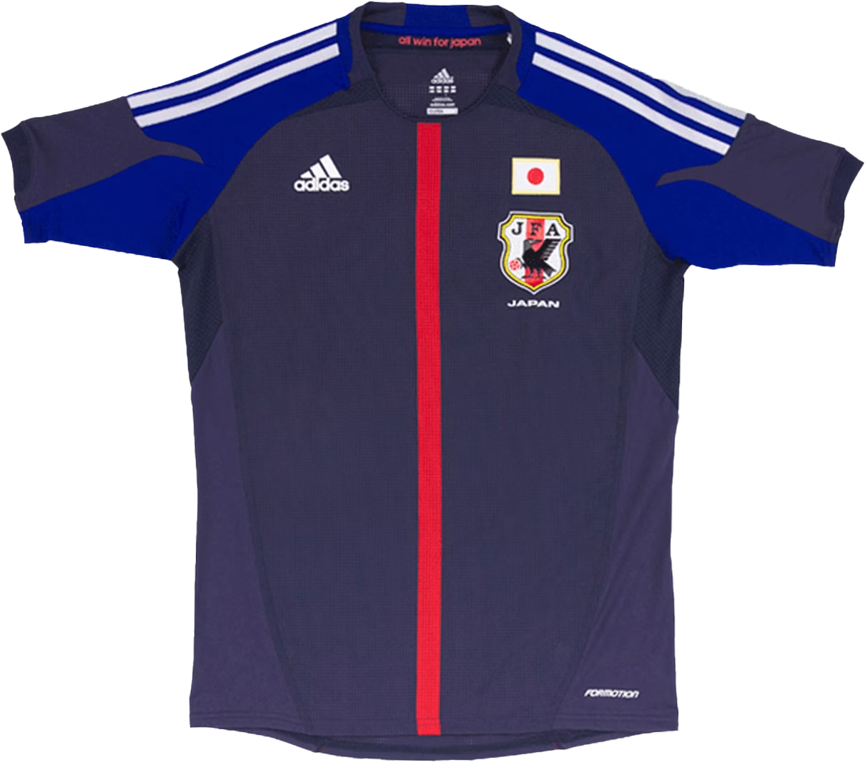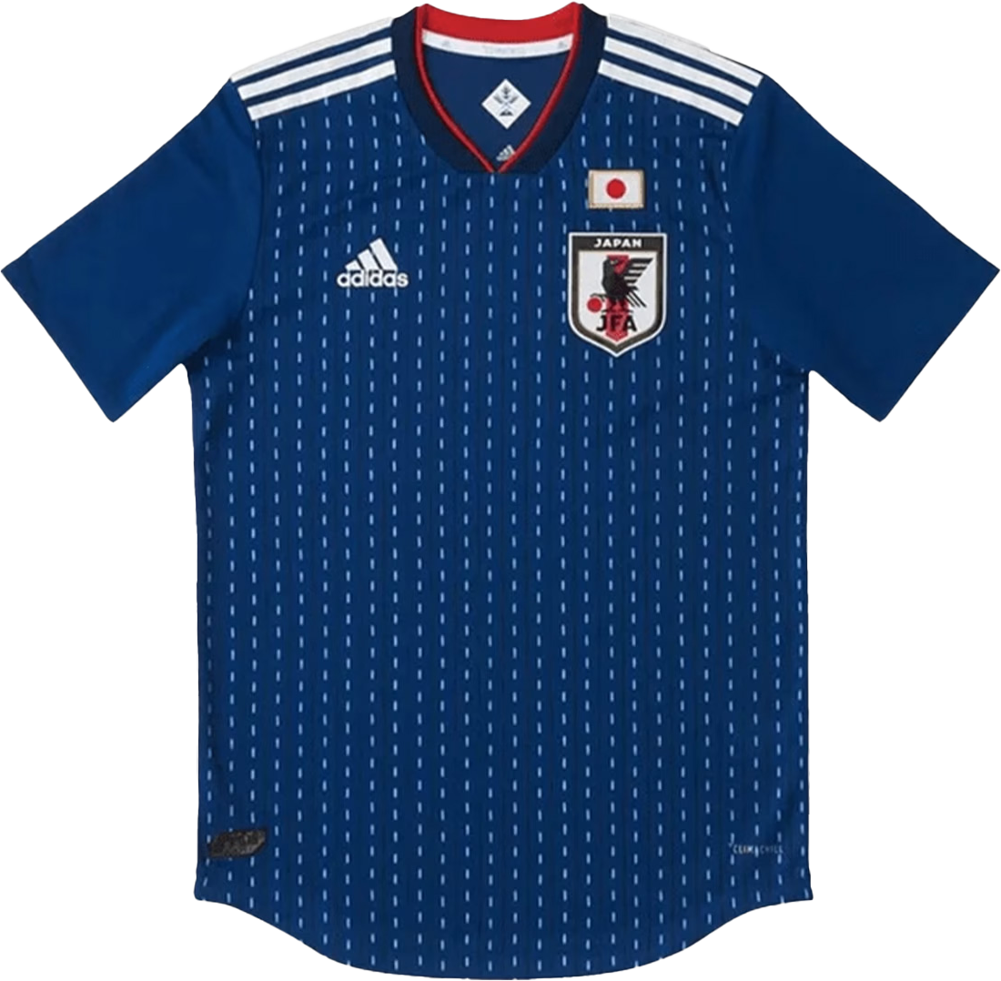 2018 FIFAワールドカップ ロシア着用。勝利への魂で染め上げた「勝色」を意味する深く濃い藍色を採用。侍の着物の前あわせ部分にインスパイアされたVネックには、日の丸の赤を象徴する「ビクトリーレッド」を配している。「刺し子柄」に、これまでの日本サッカーの歴史を築いてきた選手やスタッフ、サポーター達の想いを紡ぎ、ロシア大会へ挑むというメッセージを込めている。