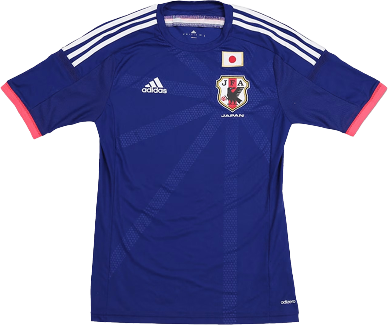2014 FIFAワールドカップ ブラジル着用。選手とサポーターがひとつとなり闘うために、「円陣」をコンセプトにデザイン。背面に施されたネオンカラー(蛍光色)の一本線は、選手やサポーターが「円陣」を組んだ際にひとつの大きな輪となるように配置されている。エンブレムを中心に広がる左胸の11本のラインは、「円陣」を組んだ後、戦いに向けてピッチへと広がる選手たちを表現。