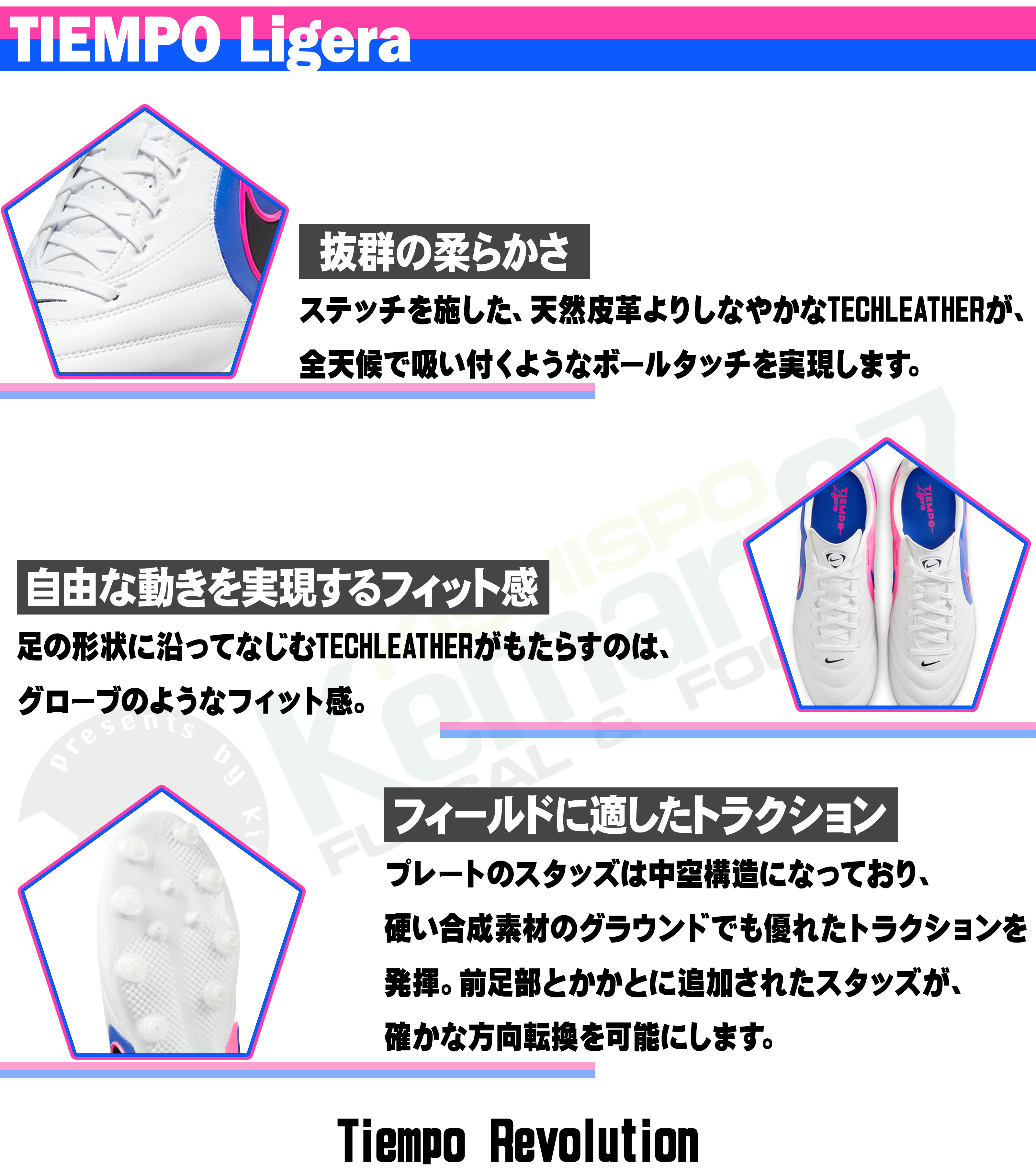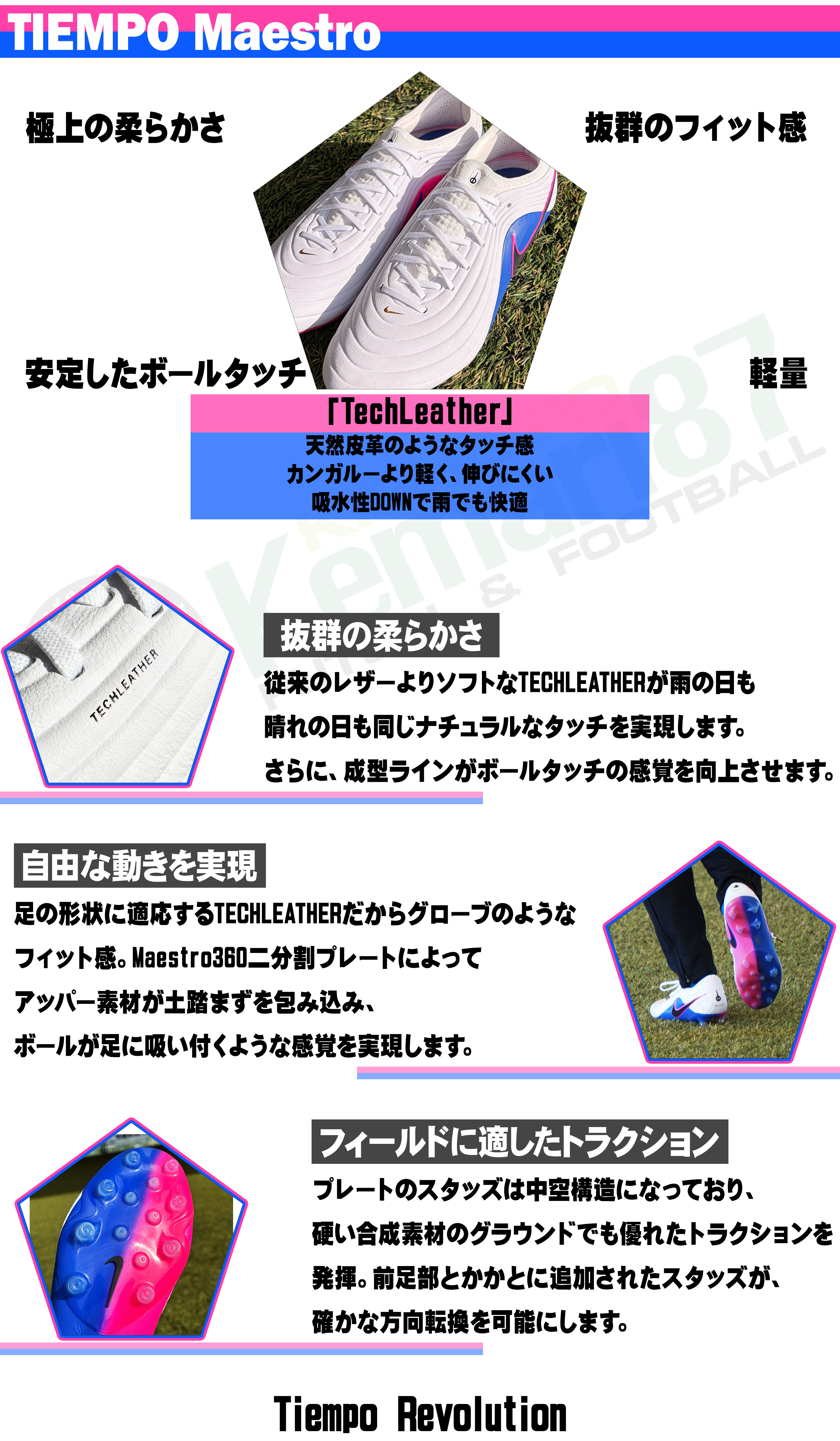 NIKEに初めてチャレンジする選手や、これまでリゲラを愛用してきた選手にぜひ履いてほしい一足。アッパーはマエストロ同様に「TechLeather」を採用。ただし本モデルはやや厚みのある素材感で、より安心感のあるフィットに感じられた。足入れ後は自然に馴染んでいく印象で、個人的にも好みの履き心地。クラシックなデザインは健在で、学生時代に着用していたリゲラを思い出させるフィッティングだった。