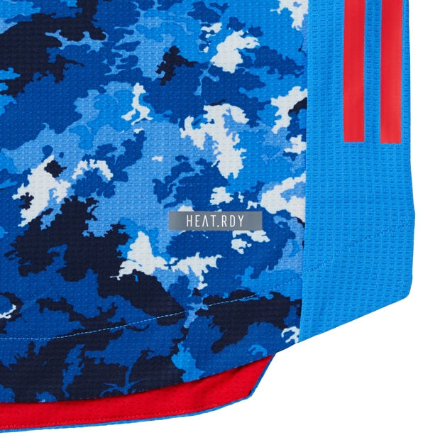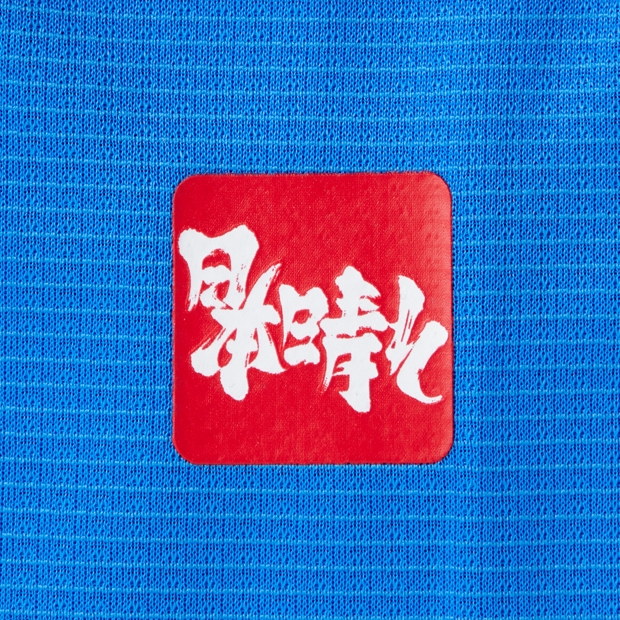 それぞれの選手やサポーターが、ぞれぞれの地点で見 てきた空が一つにつながっていく様子を、前面で5色のブルーを重ねた【スカイコラージュ】のグラフィックで表現。グラフィックの位置がそれぞれのユニフォームごとに違うため、世界に二つとして全く同じ商品は存在しない仕立てとなっている。日本代表ユニフォーム。