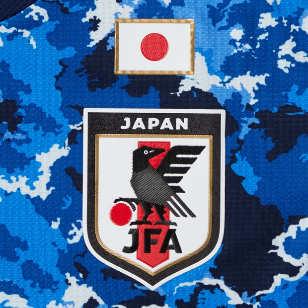 それぞれの選手やサポーターが、ぞれぞれの地点で見 てきた空が一つにつながっていく様子を、前面で5色のブルーを重ねた【スカイコラージュ】のグラフィックで表現。グラフィックの位置がそれぞれのユニフォームごとに違うため、世界に二つとして全く同じ商品は存在しない仕立てとなっている。日本代表ユニフォーム。