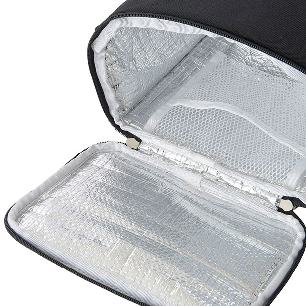保冷力のあるアルミを内側に貼り付け、保冷剤用のメッシュポケットを備えたクーラーバッグ。500mlのペットボトルを6本を収納可能。ランチボックスやアイシング用の氷入れとしても活躍。長さが調整可能なショルダーストラップ付き。
