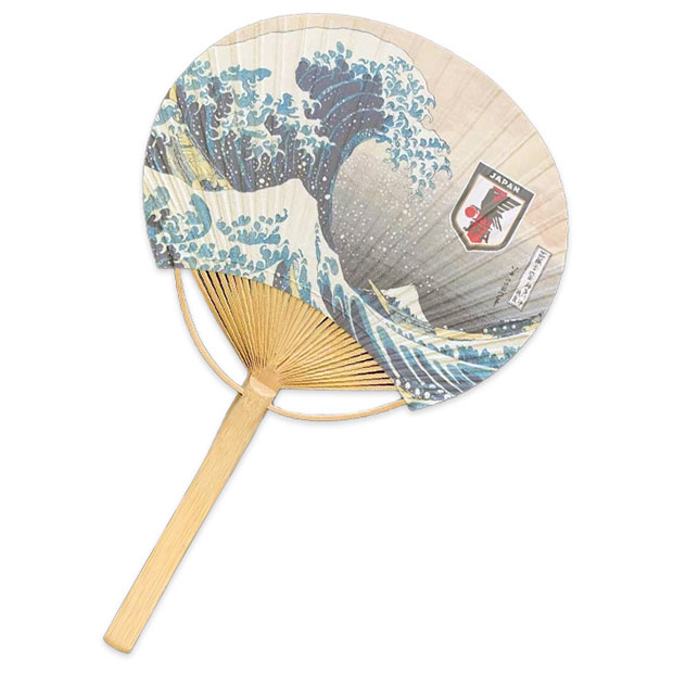 定番のサポーターズアイテム。日本代表のエンブレムに、葛飾北斎作「富獄三十六景」を組み合わせた、日本らしいデザインのうちわ。