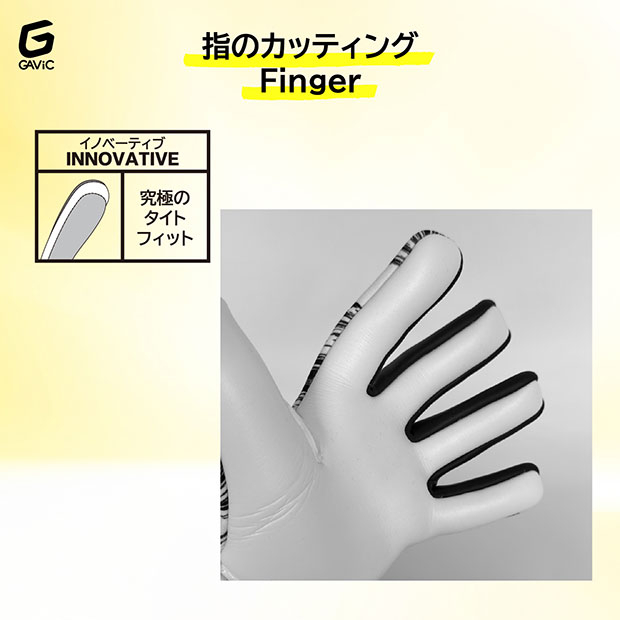 フットサル専用設計の、Fリーガーも着用するプロモデル。素手感を発揮するべく設計されたイノベーティブカット。手首はホールド力を高めるストラップ形状。