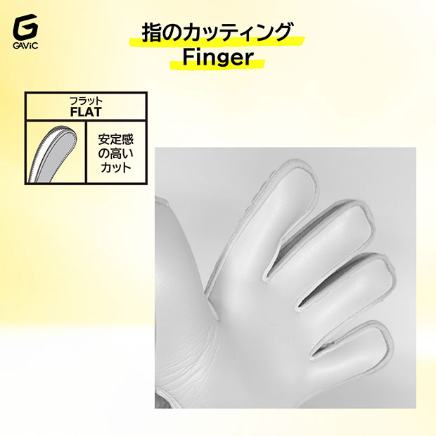 ガビック独自のフラットカットプロモデル。人差し指と小指のバックハンドをロール形状にすることで自然な指の動きをサポートする、安定感の高いフラットカットを採用。