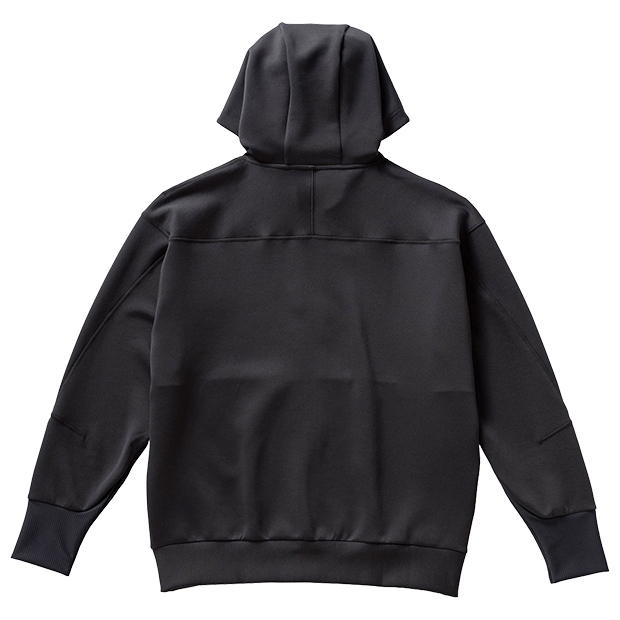 MORELIAシリーズのアパレルコレクション。両面ピーチ起毛のソフトで綿ライクな風合いが特徴の素材を採用した滑らかな肌触りのフルジップフーディ。オフショルダーにしたリラックスシルエット。袖先やフードの内側にテクスチャーのある生地を採用し、ステッチパターンに拘ることでテクニカルな雰囲気を表現。左胸のロゴと裾のシュータンデザインはエンボス加工仕様。