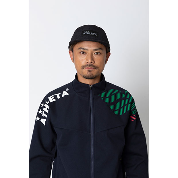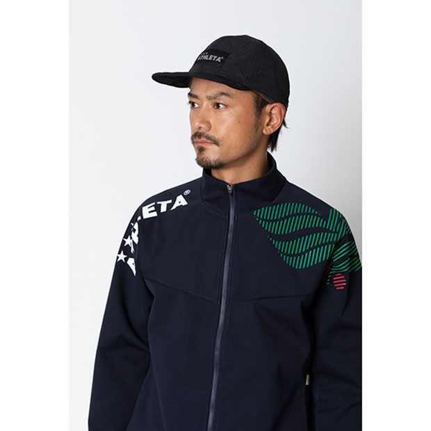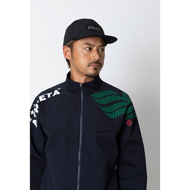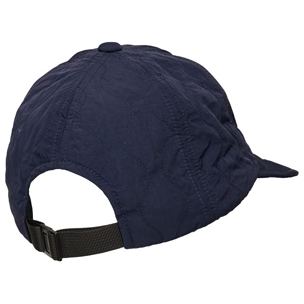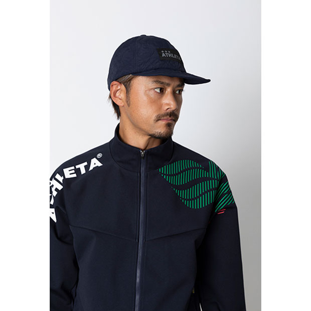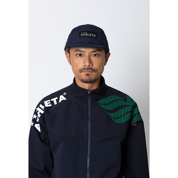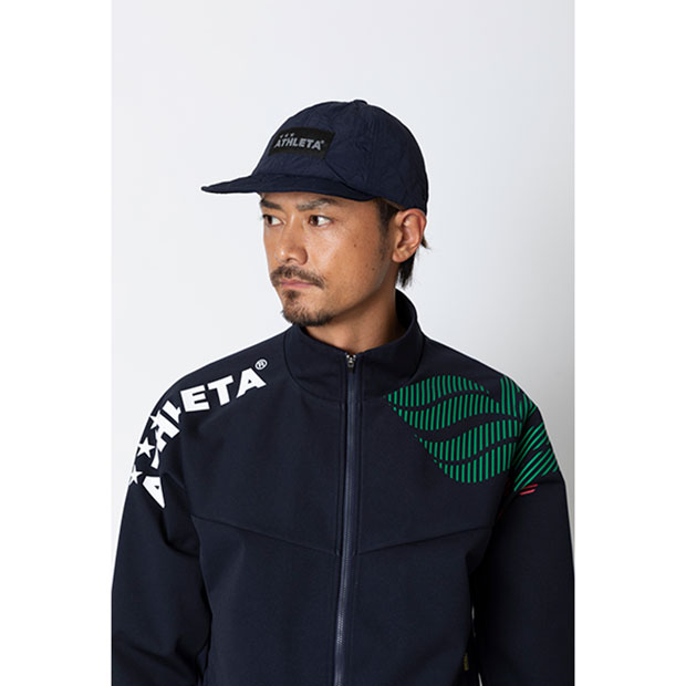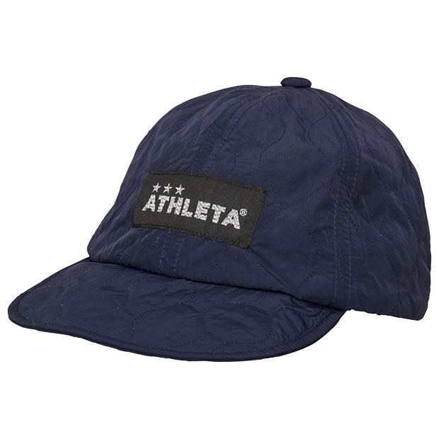 ロゴタグ付きのコーチングキャップ。冬場でも暖かい中綿仕様。