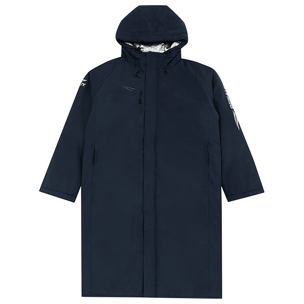 背面とアーム部分にブランドロゴを配したスタンダードなデザインのロングコート。防風性に優れた生地と軽量で動きやすい中綿を使用。フード裏のアルミプリントで保温力を向上。