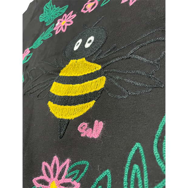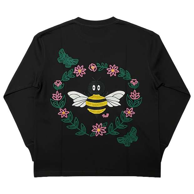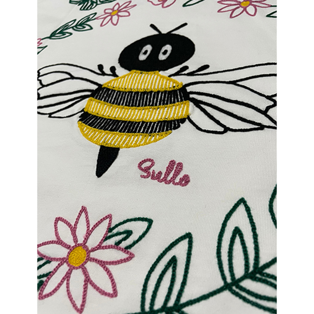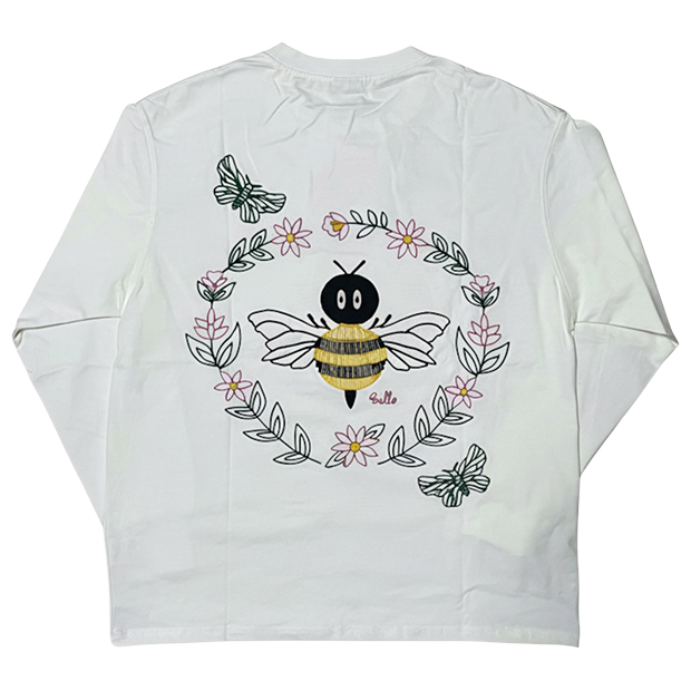 スーちゃんとミツバチの刺繍がかわいい、ハッピーな印象のロングスリーブシャツ。着心地の良い中肉のコットン100%生地を使用。