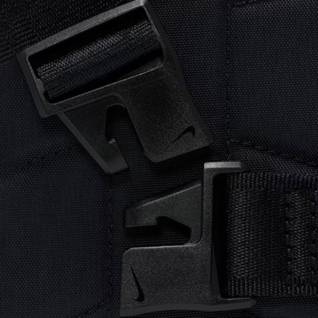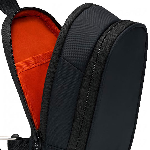 底部のジッパーを開くことで収納スペースが拡大。フックを使ってメインバッグに取り付け可能。られます。ショルダーストラップで快適なフィット感に調節可能。前面上部に、スマートフォンなどの小物をすばやく出し入れ可能なジッパー付き。
