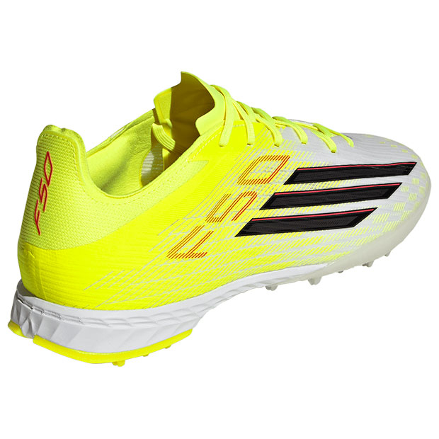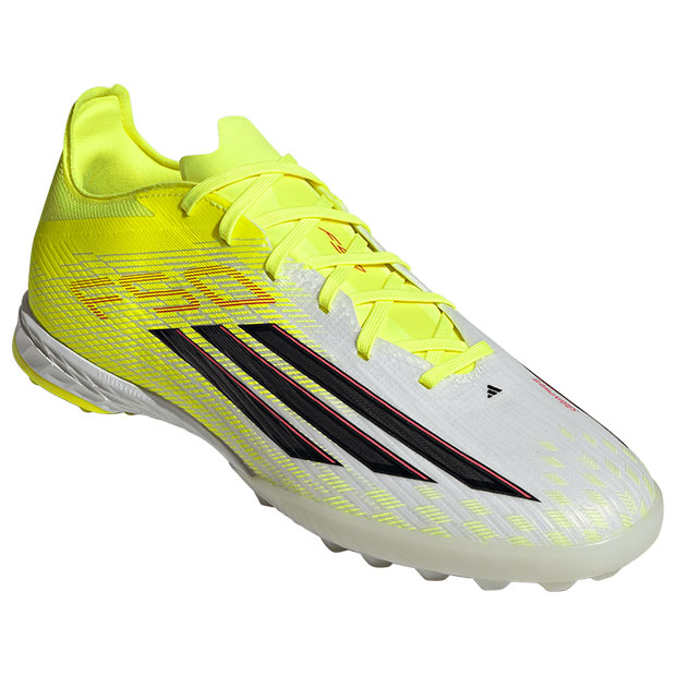 アディダスのアイコニックなスピードコンセプトモデル「F50」のターフトレーニングモデル。ボールを保持し続けるためのスプリントウェブ3Dテクスチャーを施した軽量ファイバータッチアッパーと、ロックダウン用のコンプレッションフィットシュータンを装備。薄型のLightstrikeミッドソールとラグラバーアウトソールが、人工芝グラウンドでの動きをサポート。人工芝コート対応。