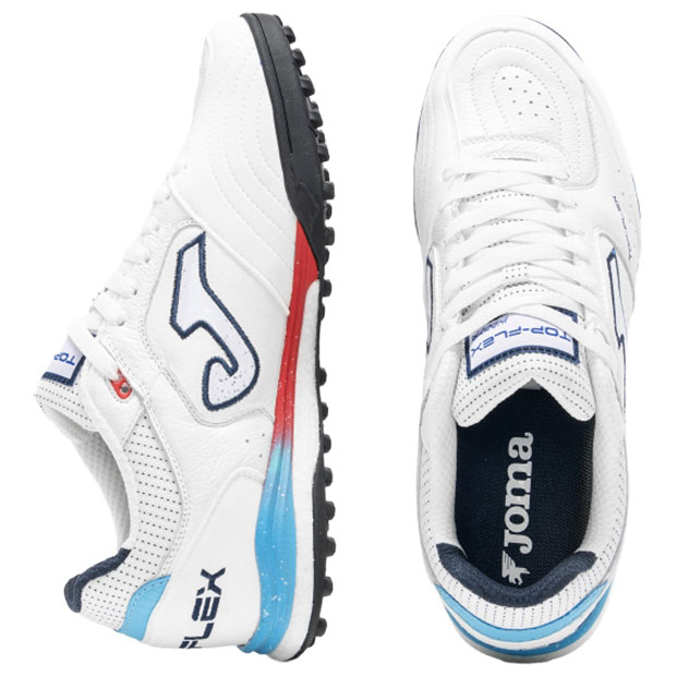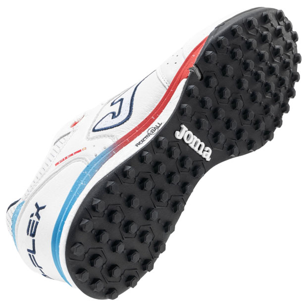 柔軟性とフィット感、安定性を兼ね揃え、フットサルにおいて高いパフォーマンスを発揮するように設計された、スペインフットサルリーグで人気のレザーアッパーモデル、厚底ターフトレーニング仕様。アッパーに非常に柔軟性の高いプレミアムレザーを使用。内側に高品質ナイロンを使用。つま先部分はシュート用に強化。TOP FLEX先端の内側は革を若干厚く設計し、耐久性を強化。人工芝グラウンド対応。