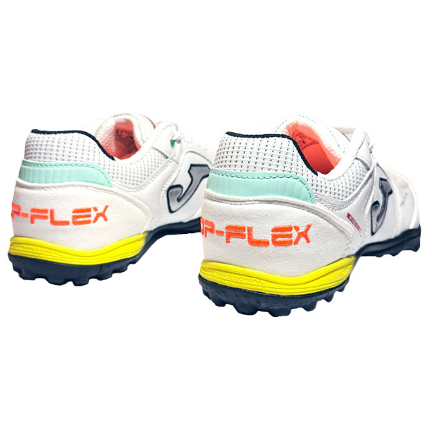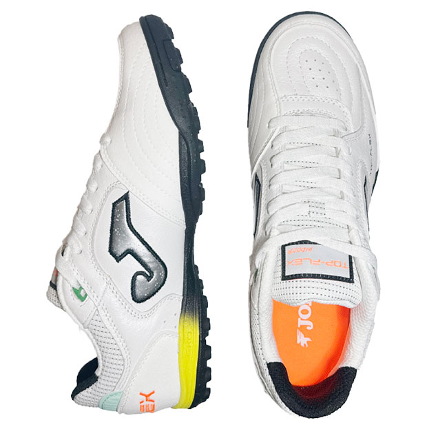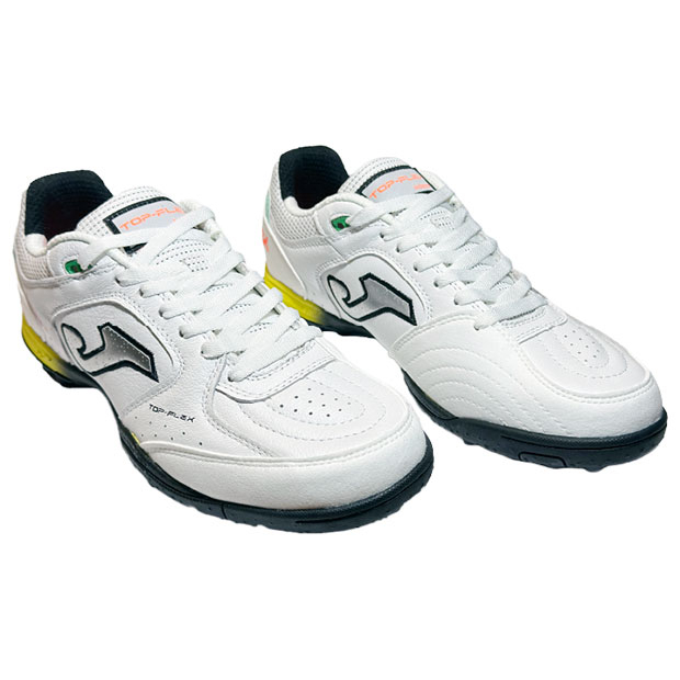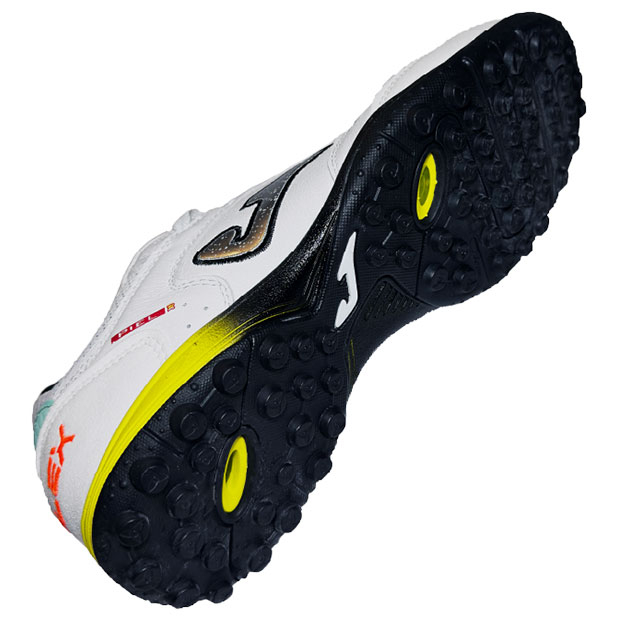 柔軟性とフィット感、安定性を兼ね揃え、フットサルにおいて高いパフォーマンスを発揮するように設計された、スペインフットサルリーグで人気のレザーアッパーモデル、ターフトレーニング仕様。アッパーに非常に柔軟性の高いプレミアムレザーを使用。内側に高品質ナイロンを使用。つま先部分はシュート用に強化。TOP FLEX先端の内側は革を若干厚く設計し、耐久性を強化。人工芝グラウンド対応。