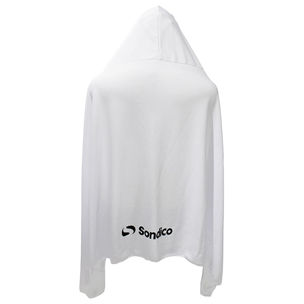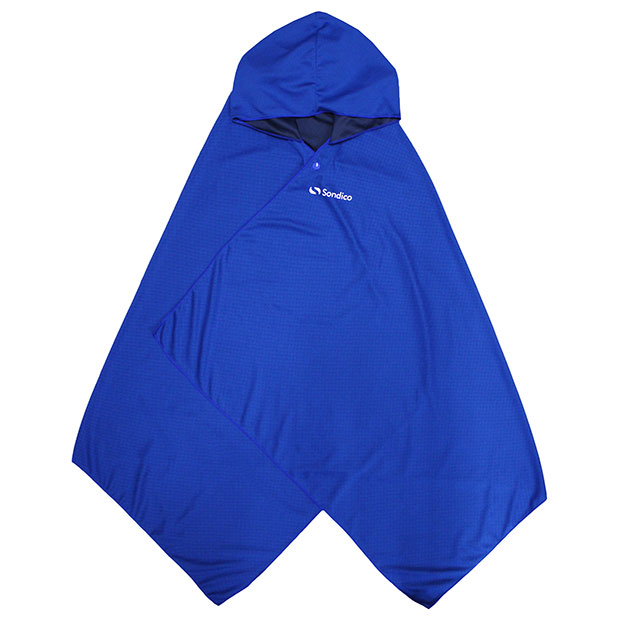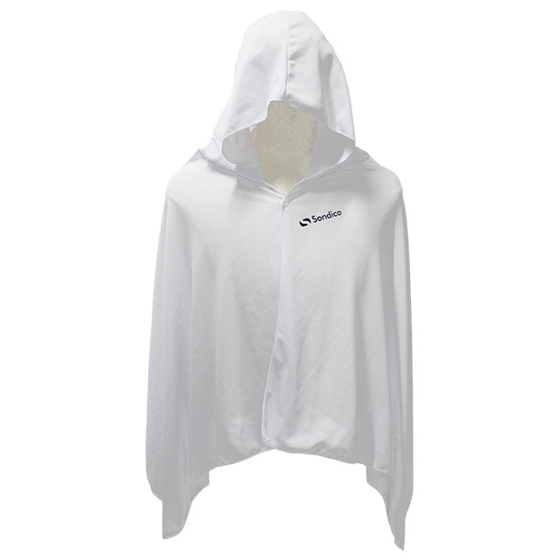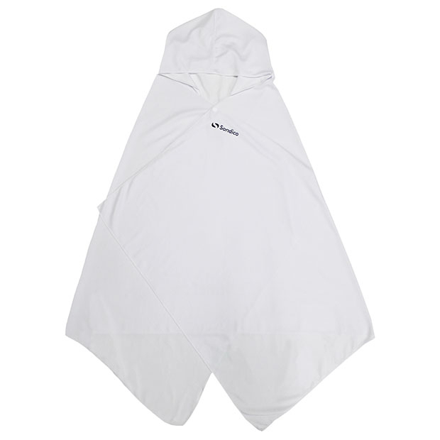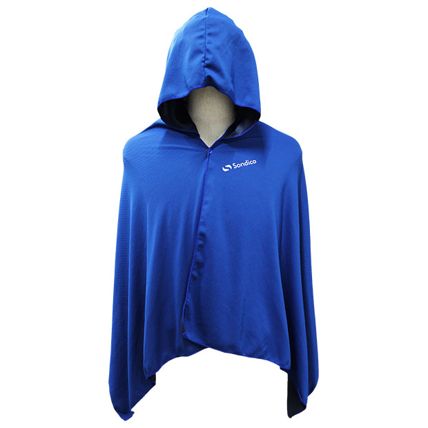 水に濡らして絞って振ることで冷却効果を発揮するクーリングポンチョ。内側に接触冷感素材を使用。熱中症・UV対策に最適。
