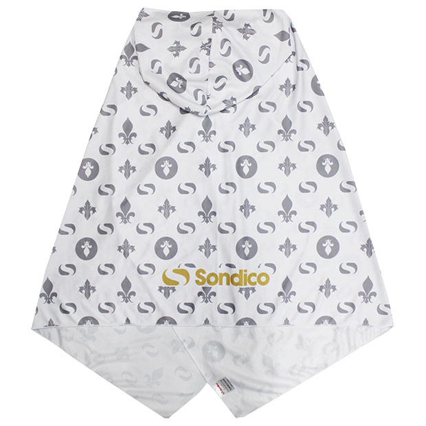 水に濡らして絞って振ることで冷却効果を発揮するクーリングポンチョ。内側に接触冷感素材を使用。熱中症・UV対策に最適。