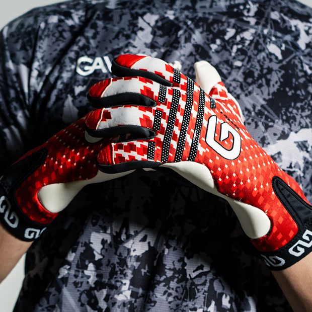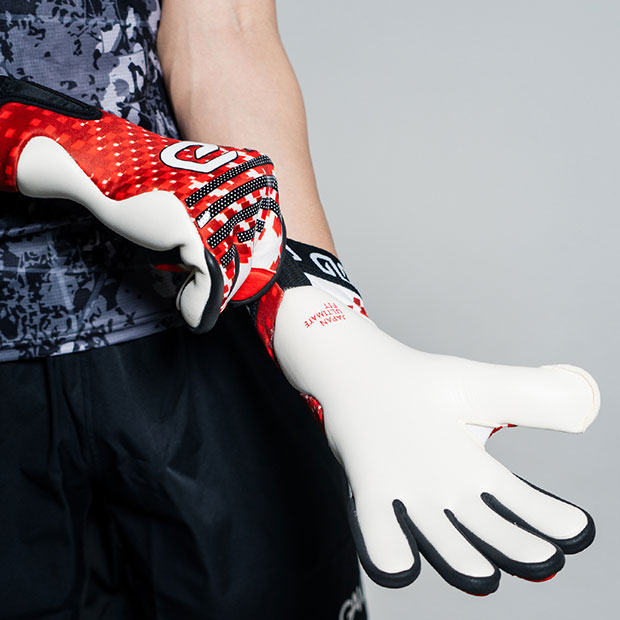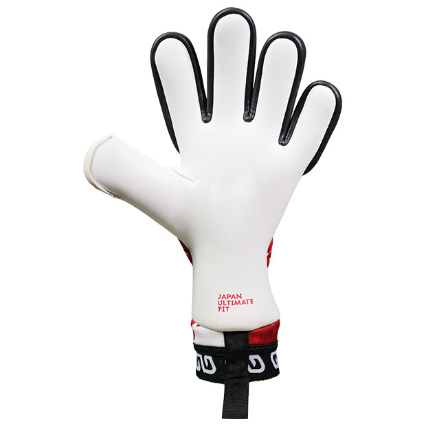 イノベーティブカットモデルの究極版。ストラップレスで快適に装着できる独自設計「ジャパンアルティメットフィット」モデル。指のカッティングをタイトにすることで究極のフィット感を実現。指先にホールド力と耐久性を高めるグリップパーツを配置。