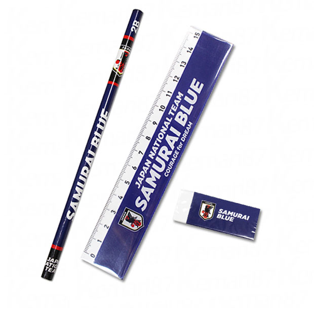 定番のサポーターズアイテム。鉛筆、消しゴム、定規、ペンケースのステーショナリー4点セット。
