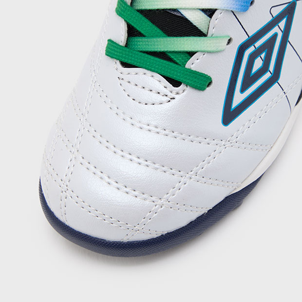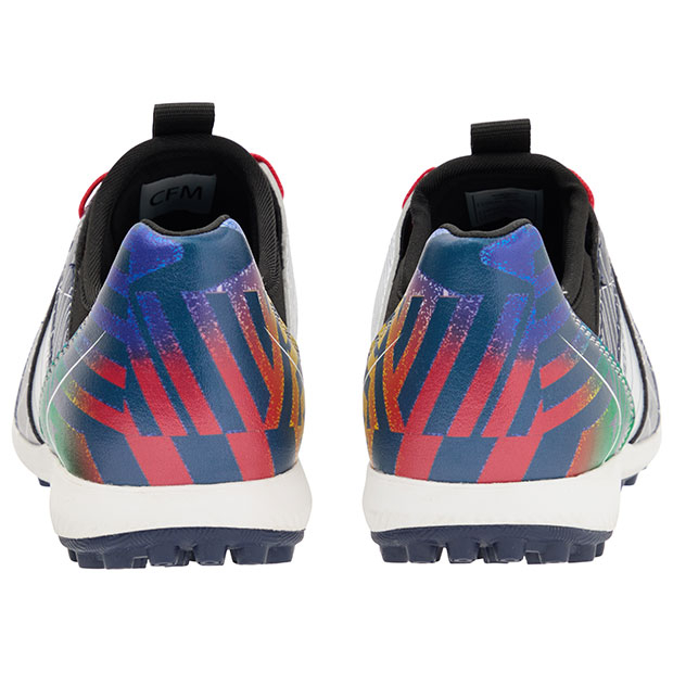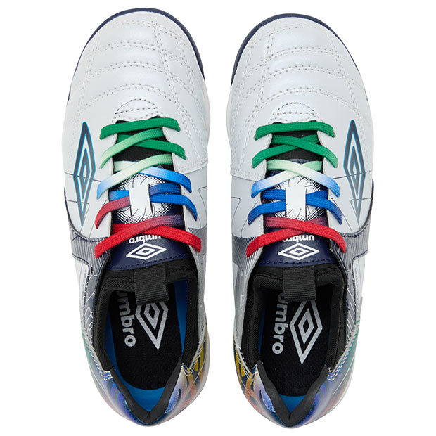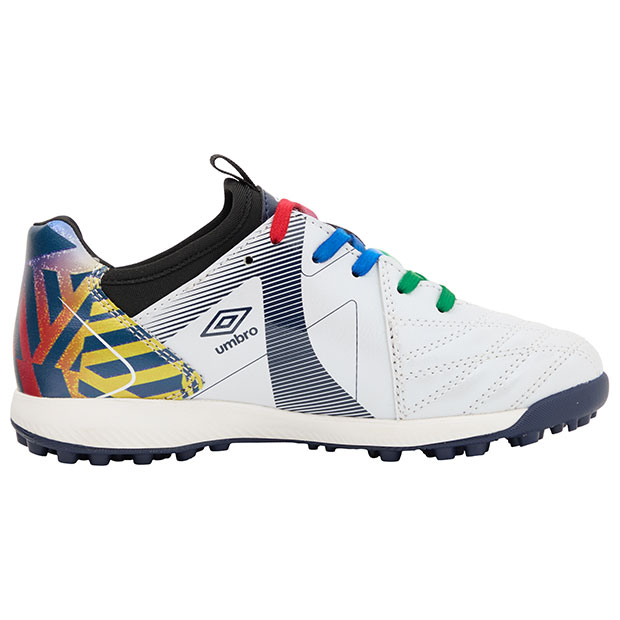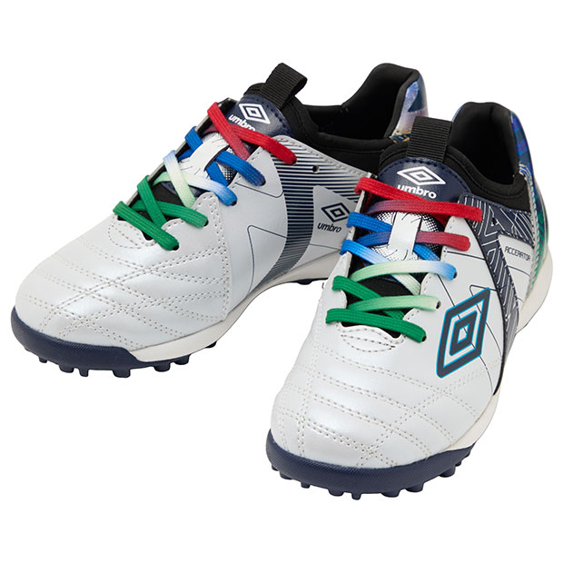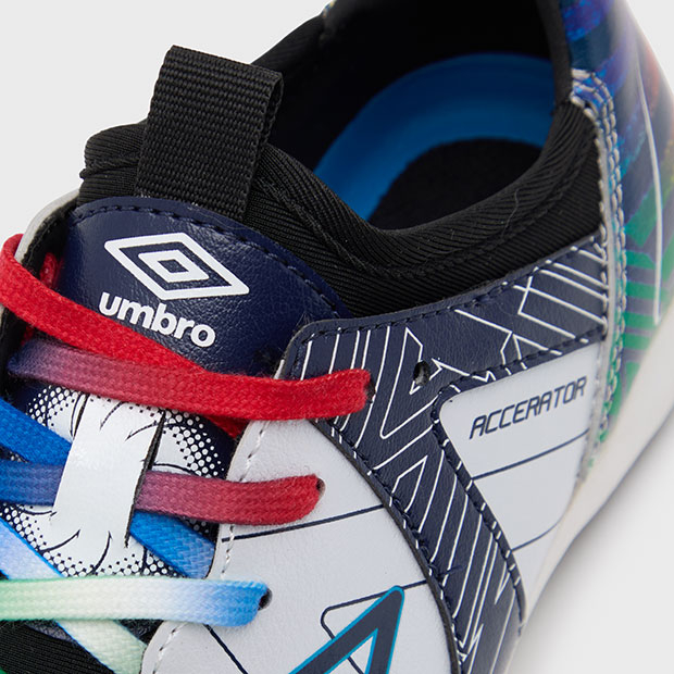 「ACCERATOR」シリーズのスターター・ステップアッププレーヤー向けワイドラストモデル。アンブロが持つフィッテイングサポートファンクションのAフレームをグラッフィクデザインで表現。インステップキック時のインパクトを意識しやすいプリント加工を採用。104本のラバースタッドでグリップし、屈曲性を考慮したアウトソールを採用。クッション性と反発性を考慮したインジェクションEVAをミッドソールに採用。取り外し可能なEVAカップインソールを搭載。1994年のアメリカW杯当時にアンブロを着用していたイングランド・メキシコ・ブラジルそれぞれの国旗カラーでグラフィックを表現した、レプリキットコレクション。